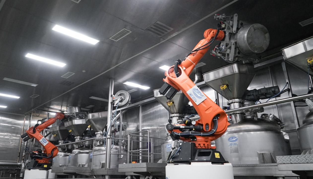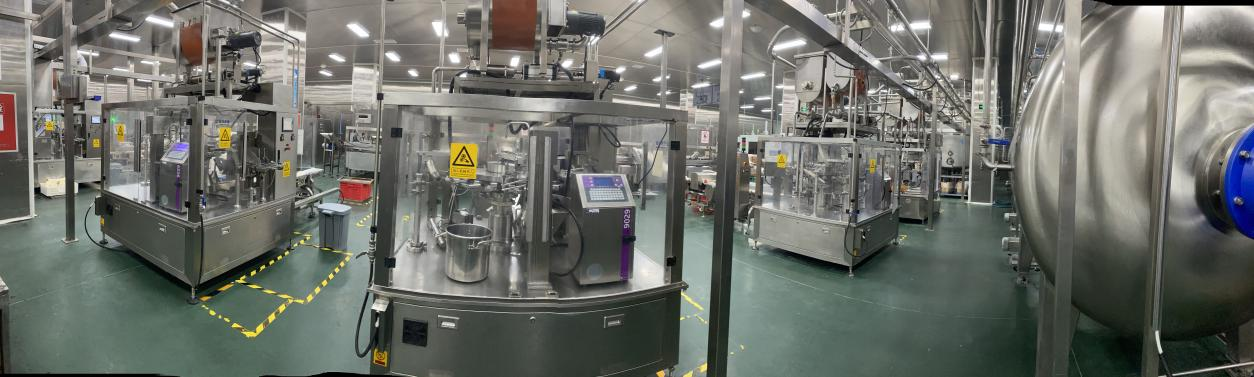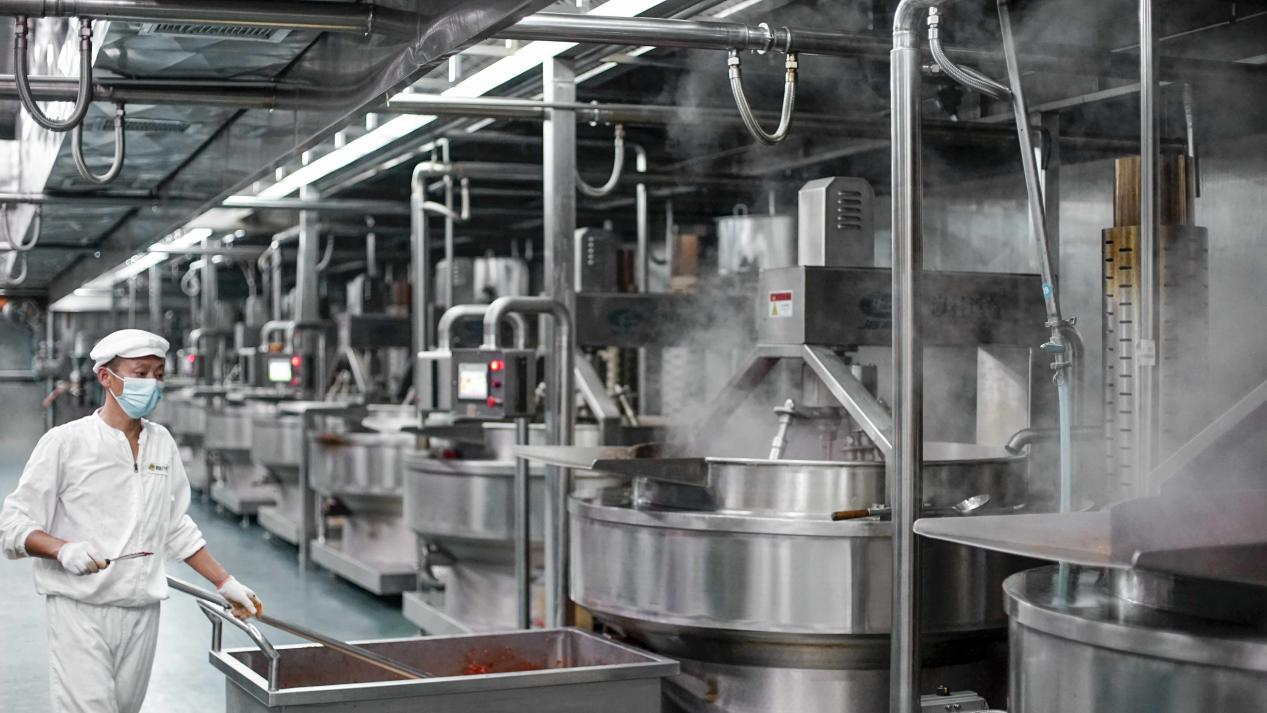 行業內首家采用反應釜和機器人進行火鍋底料炒制,車間配備12臺反應釜,4臺機械臂炒料機器人及4套智能控制系統。單釜單日產量可達8噸,全年總體產量可達2.8萬噸,在提升產能和穩定產品品質的同時,還能通過蒸汽循環和釜內120度的固定溫控,使決定火鍋底料香氣的主要成分“烯類成分”較傳統炒制工藝高出26.9%。
