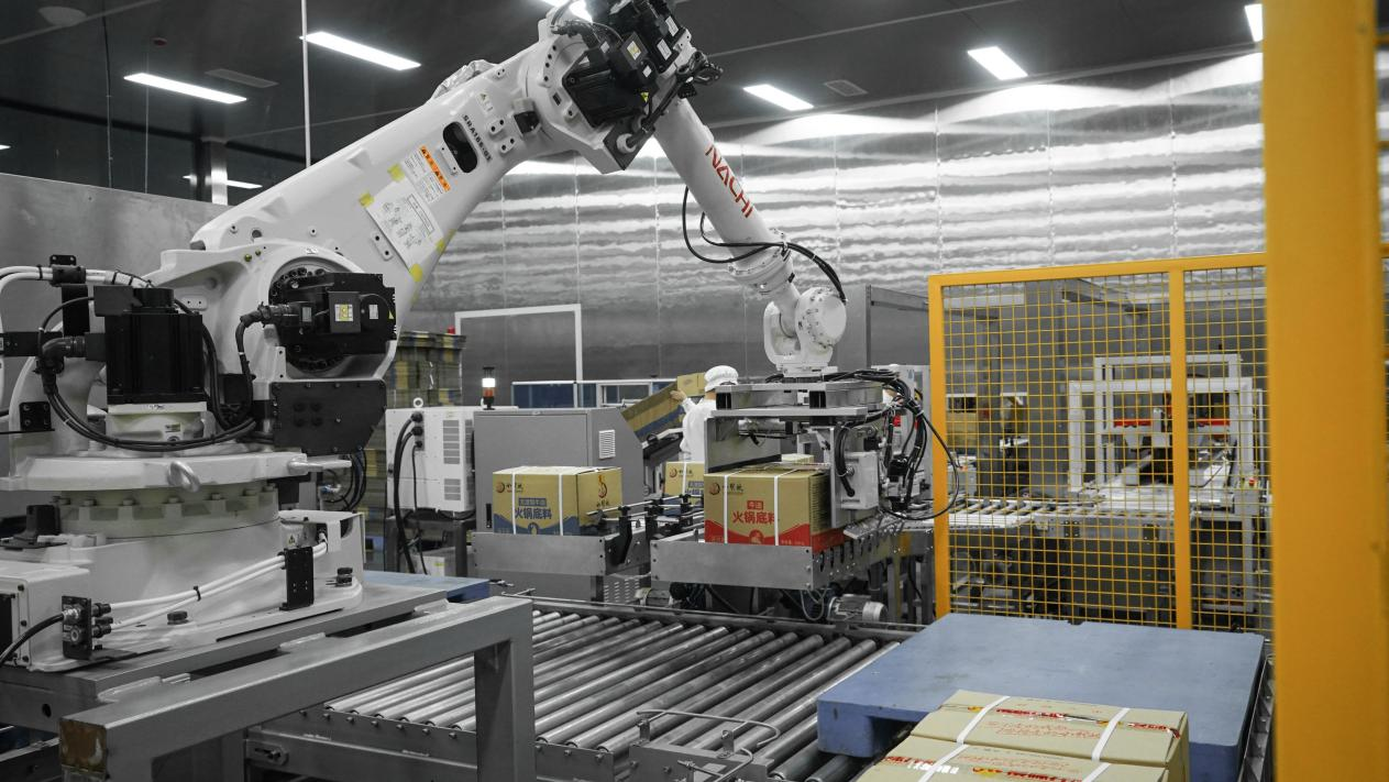 裝箱碼垛:采用德國STAUBLI裝箱機器人連動日本NACHI碼垛機器人對產品進行分類包裝和碼垛,單日碼垛量可達7000箱。