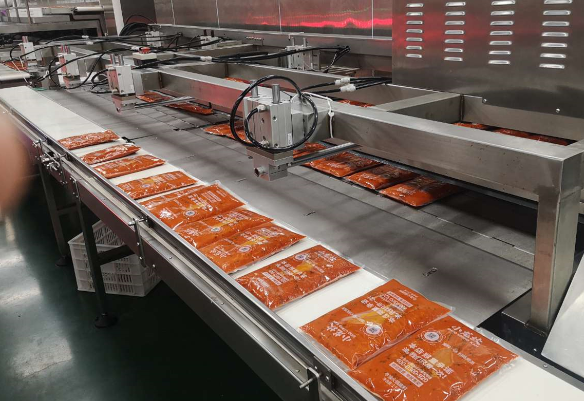 采用2臺裝箱機器人對產品進行自動化裝箱封箱,無人為引入異物風險,大大提升每日產能和效率。無論是底料、蘸料、還是川調產品,全面覆蓋終端場景所應用的美食產品,都將通過這一環節實現最終成品的對外輸出。